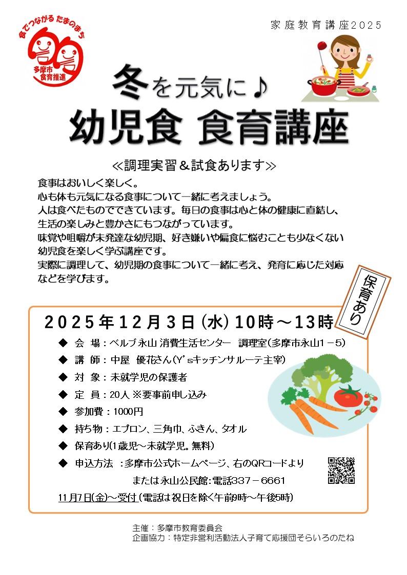 講師は中屋優花さん(Y’sキッチンサルーテ主宰)です。参加費1000円。QRコードからお申し込みください。保育あります